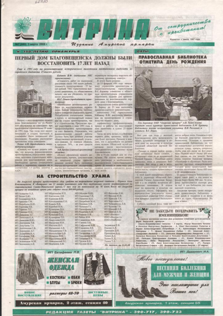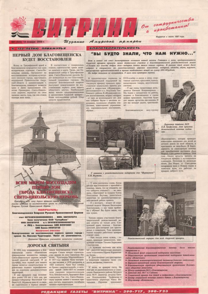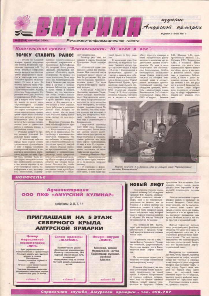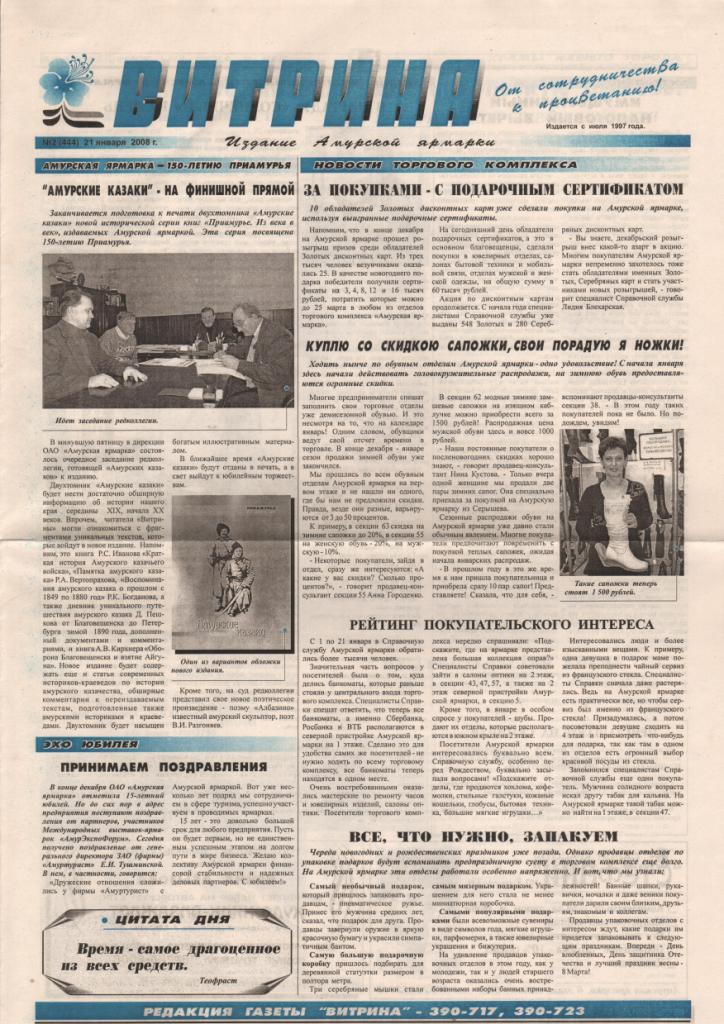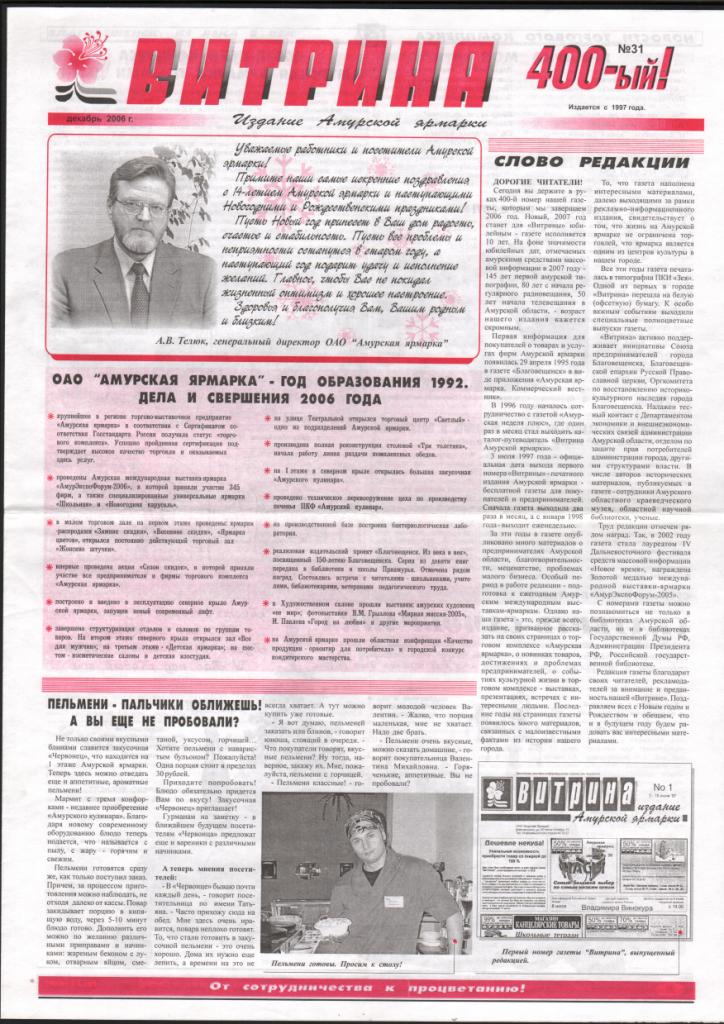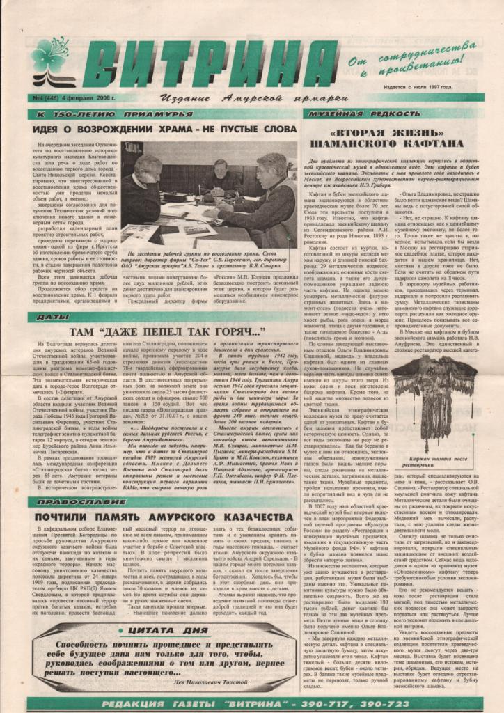 В документальный фонд музея переданы газеты «Витрина», изданные Амурской ярмаркой в период с 2006 по 2008 гг. На страницах газеты представлена информация по истории г. Благовещенска и Амурской области конца 19 – начала 20 вв.