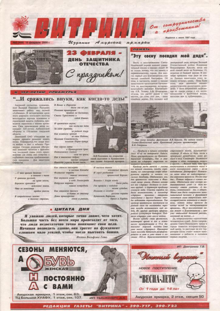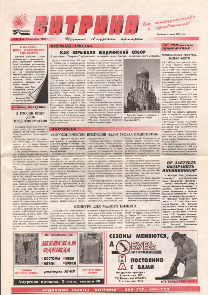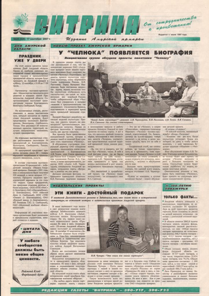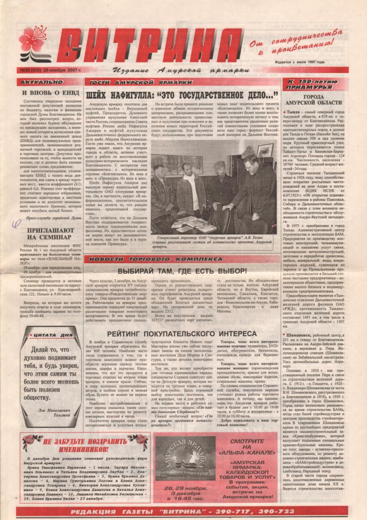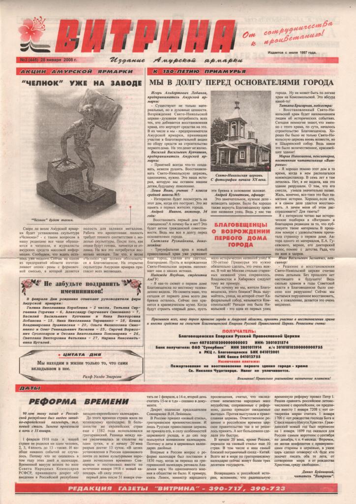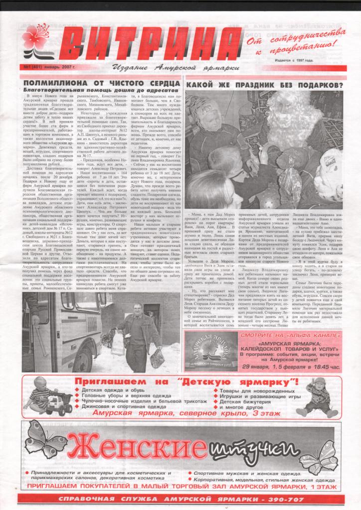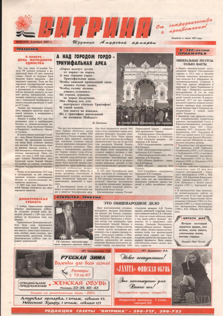 В документальный фонд музея переданы газеты «Витрина», изданные Амурской ярмаркой в период с 2006 по 2008 гг. На страницах газеты представлена информация по истории г. Благовещенска и Амурской области конца 19 – начала 20 вв.