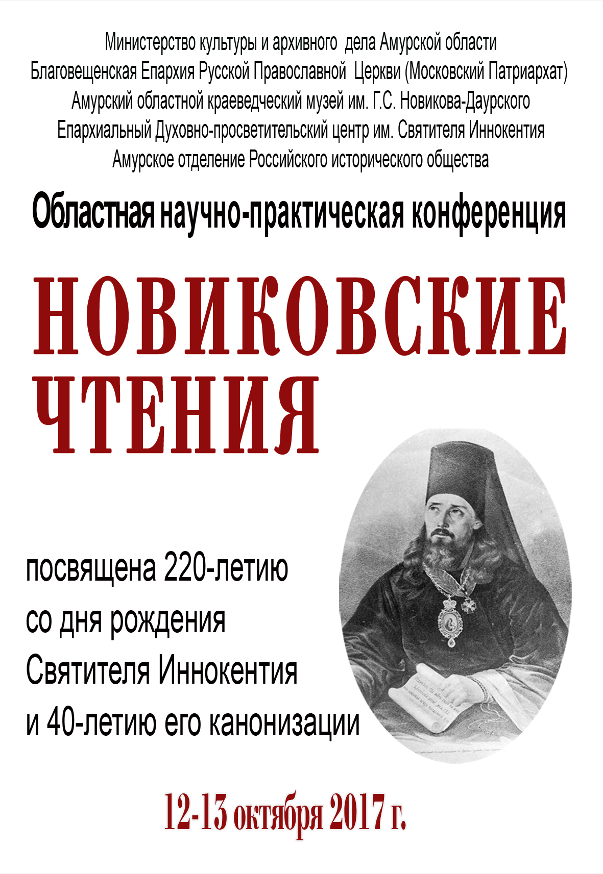 12-13 октября 2017 г. в Амурском областном краеведческом музее состоится областная научно-практическая конференция «Новиковские чтения», посвященная 220-летию со дня рождения Святителя Иннокентия и 40-летию его канонизации.