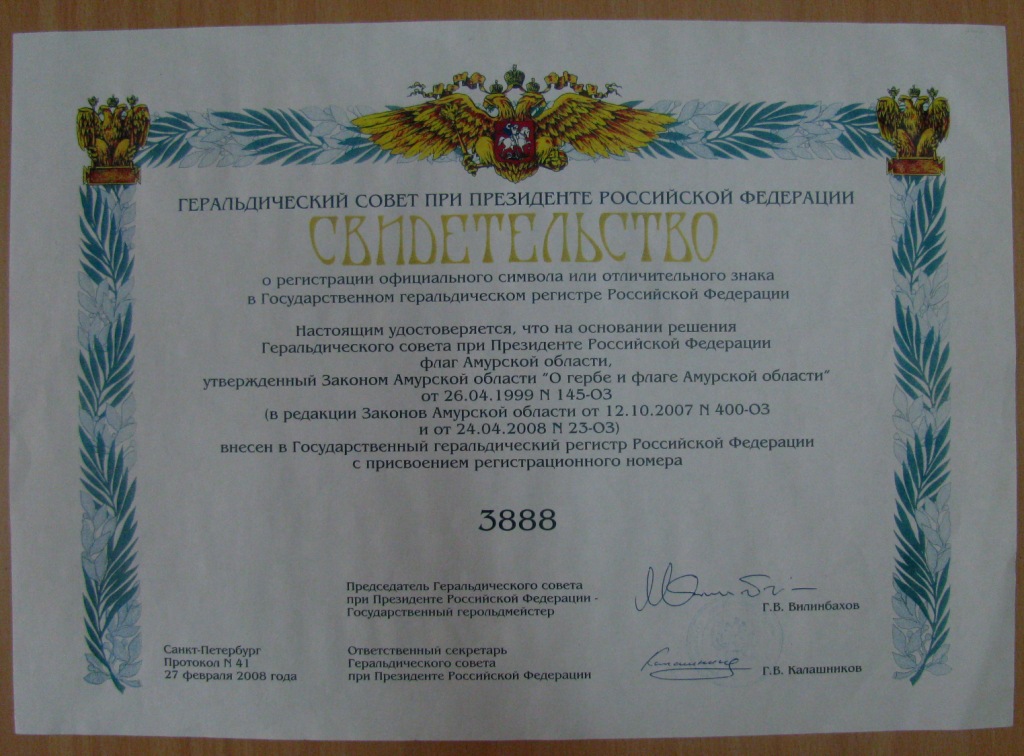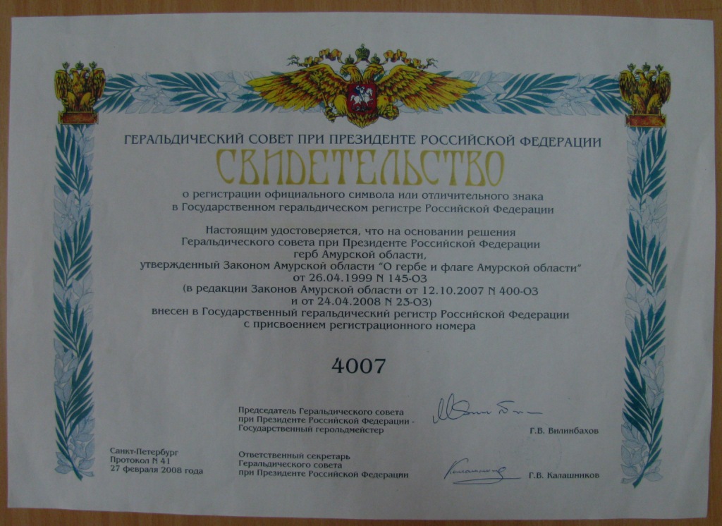 В коллекцию «Документы» переданы свидетельства Геральдического совета при Президенте Российской Федерации о внесении герба и флага Амурской области в государственный геральдический регистр Российской Федерации с присвоением регистрационного номера.