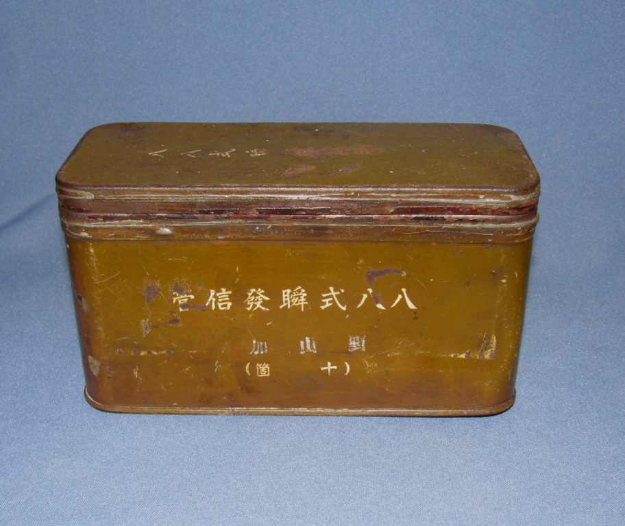 На коробках на японском языке надписи, в переводе означающие «Взрыватель мгновенного действия тип 88». В таких коробках хранились головные взрыватели, которые использовались для полевой, горной артиллерии, применялись для подрыва основного заряда боеприпаса.