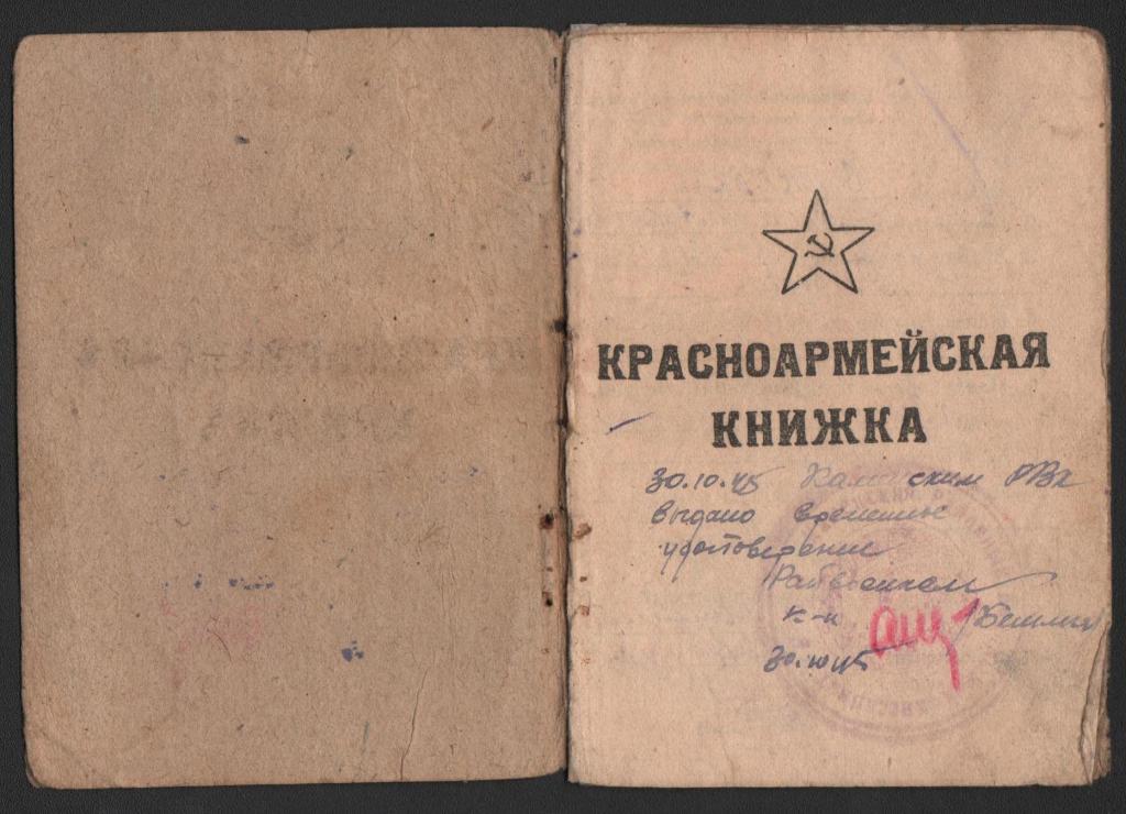 Комплекс материалов об участниках Великой Отечественной войны 1941-1945 гг. пополнит музейную коллекцию. Санитарная книжка, тетрадь поверки техники пилотирования сержанта Киселёва Михаила Григорьевича представляют период его службы в 34 отд. авиационной эскадрилье военно-воздушных сил Тихоокеанского флота в качестве пилота самолёта У-2, в документах отражены полётные задания с оценками их выполнения. Красноармейская книжка Хижняка Василия Адамовича, разведчика, отражает период его службы во взводе пешей разведки на западном берегу реки Одер и демобилизацию в 1944 – 1945 гг.