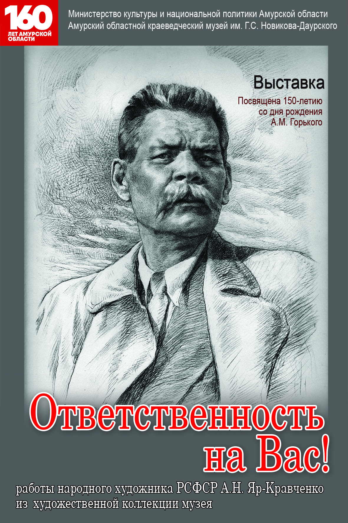 13 марта 2018 г. в Амурском областном краеведческом музее начинает работу выставка «Ответственность на Вас», посвященная 150-летию со дня рождения Алексея Максимовича Горького (1868-1936) – одного из самых значительных и известных в мире и , прозаика и драматурга.