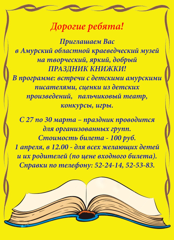 ПРАЗДНИК КНИЖКИ Амурский областной краеведческий музей 15.03.2018 00:00 Читать:3 сек. Share VK Pinterest Email Источник новости: http://museumamur.org/novosti/prazdnik_knizhki
