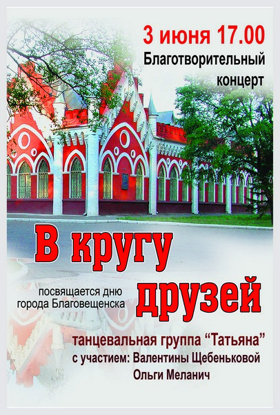 Концерт танцевальной группы «Татьяна» Амурский областной краеведческий музей 28.05.2018 00:00 Читать:12 сек. Share VK Pinterest Email 3 июня 2018 г., в 17.00, в музее состоится благотворительный концерт «В кругу друзей» танцевальной группы «Татьяна», посвященный Дню города. В концерте принимают участие Валентина Щебенькова и Ольга Меланич. Источник новости: http://museumamur.org/novosti/koncert_tancevalnoj_gruppy_tatyana