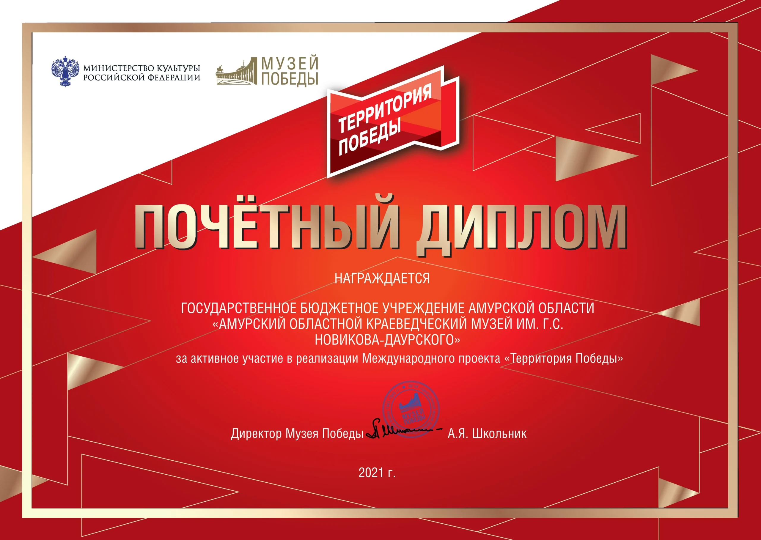 Музей Победы (г. Москва) наградил своего партнера — Амурский областной краеведческий музей — Дипломом за активное участие в реализации Международного проекта «Территория Победы».