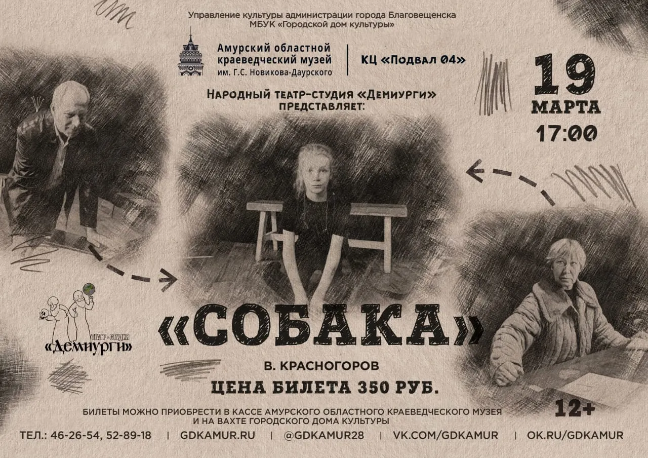 «Собака», трагедия в двух действиях. Одинокий мужчина находит щенка, и очень быстро эта маленькая преданная собачка становится его единственной радостью и утешением. Она отвечает на эту заботу беззаветной любовью и преданностью. Но наступает день, когда надо сделать выбор — увольняться с работы или избавиться от собаки. Столкновение двух правд персонажей пьесы, их несхожих взглядов на подлинный смысл жизни заставляет с замиранием сердца следить за развитием событий. В ролях: Людмила Гороженко, Алексей Плахонин и актриса образцовой детской театральной студии «Этюд» Светлана Стрекачёва. Спектакль состоится 19 марта в 17:00 в культурном центре «Подвал 04».