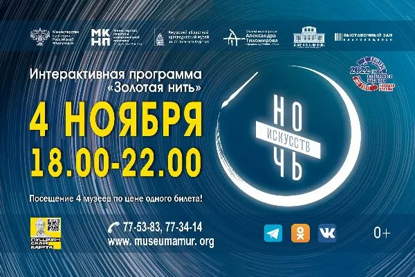Музейно-выставочный центр «Дом И.А. Котельникова»:«Бедолаги»: музыкальный спектакль (детский театр «Фантазёры» Центральной детской школы искусств г. Благовещенска, режиссер-постановщик рук. театра Ольга Васенина.). 0+ «Художница осень ещё не зима!»: концертная программа баянистов и аккордианистов (учащиеся отделения народных инструментов Центральной детской школы искусств г. Благовещенска, преп. Ирина Калита). 6+ «В гости к И.А. Котельникову»: интерактивная экскурсия. 6+ -мастер-классы амурских мастеров |
