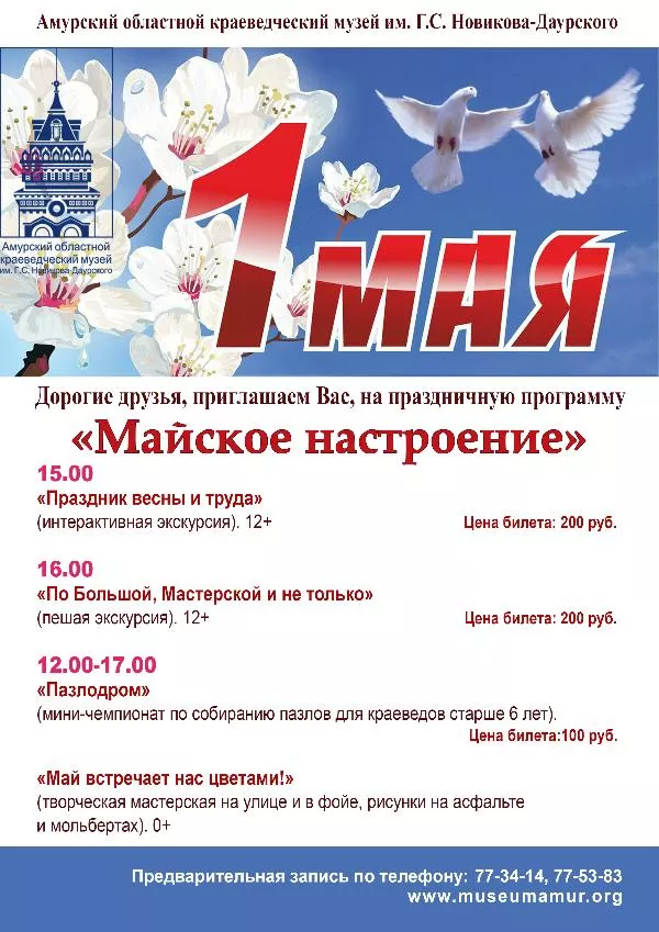 Музей работает для Вас 1 мая с 10.00 до 19.00.