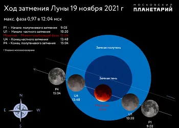 В 19:48 закончатся частные фазы. Луна полностью выйдет из земной тени, а к 21:04 она покинет и зону земной полутени.
