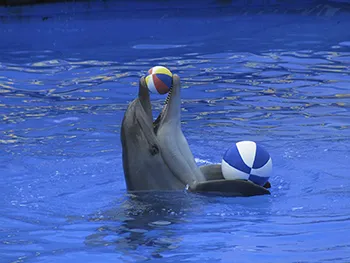 В океанариуме пояснили, что во время тренировочного процесса дельфин заныривает в воду, а тренер с помощью специальной указки шлепками по воде показывает, где дельфину нужно вынырнуть. В таком случае животное использует эхолокацию.
