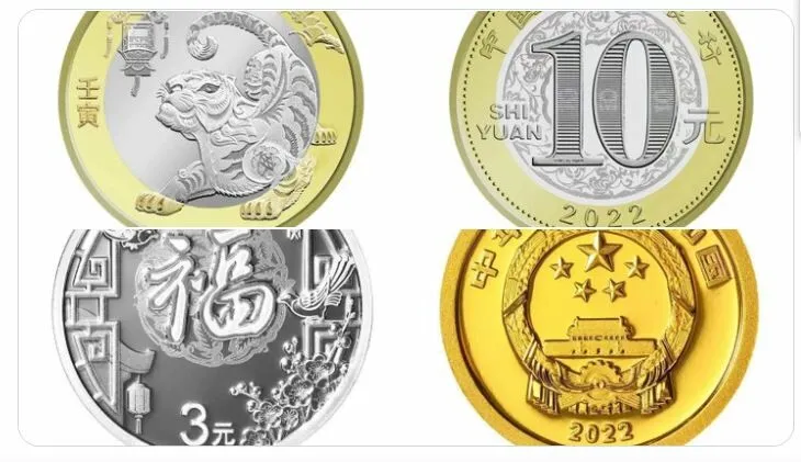Народный банк Китая выпускает к наступающему 2022 году комплект из трёх памятных монет: золотой номиналом 10 юаней, серебряной – 3 юаня и двухцветной из сплава меди – 10 юаней. На аверсе золотой и серебряной монет изображён герб КНР, на реверсе – иероглиф «фу», который переводится как «счастье», «успех», в обрамлении традиционных декоративных элементов. А на двухцветной монете в 10 юаней изображён символ 2022 года по восточному календарю – тигр, сообщает ТАСС со ссылкой на сайт народного банка Китая.